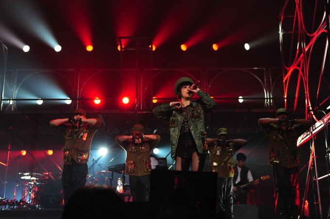 アーミールックのダンサーを従えてAIが登場。4月から続いたAIの<INDEPENDENT TOUR 2012>が、6月22日に日本武道館でファイナルを迎えた。