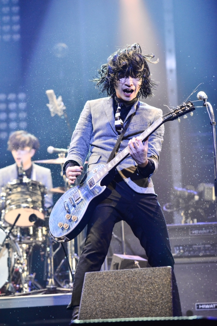 「ロックンロールの聖地、日本武道館へようこそー!全国のロッキンにいちゃん、おねえちゃん、心の準備はよろしいですか!?あれ?どこからか祭囃子が聴こえてきました。」ROY(Vo.Ba)の挨拶から“ROCK ME BABY”へ。TAXMAN(G.Vo)とJIM(G.Cho)はステージの端まで走り、2人の距離が近づいた西と東エリアは彼らに手を振り、ギタープレイに熱狂する。