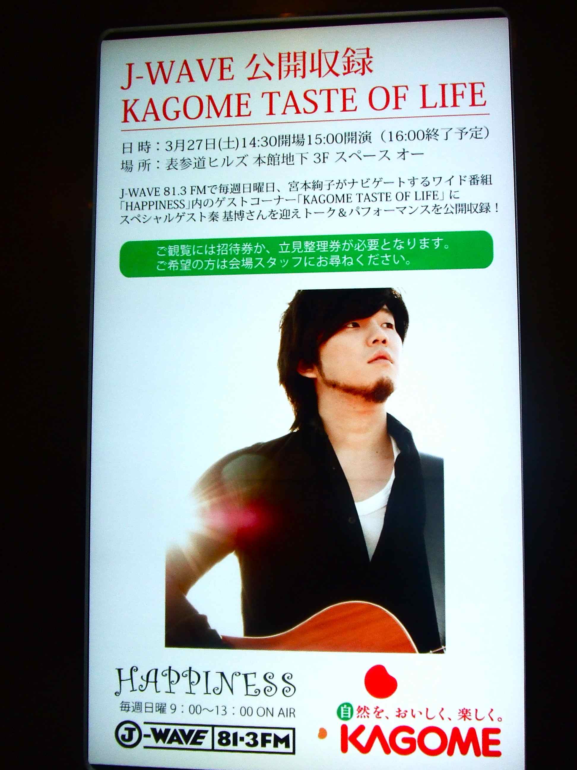 昨日はJ-WAVE「HAPPINESS」という番組の「KAGOME TASTE OF LIFE 公開収録with秦 基博」に行ってきました。